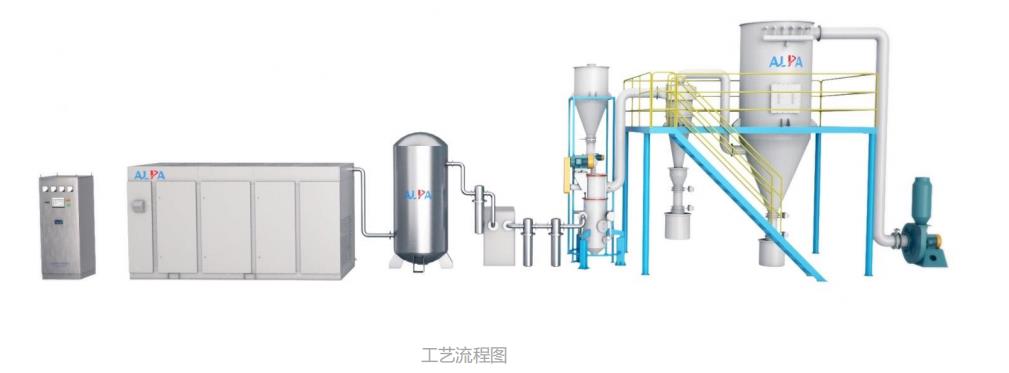 壓縮空氣經過濾干燥后,通過拉瓦爾噴嘴高速噴射入粉碎腔,在多股高壓氣流的交匯點處物料被反復碰撞、磨擦、剪切而粉碎,粉碎后的物料在風機抽力作用下隨上升氣流運動至分級區,在高速旋轉的分級渦輪產生的強大離心力作用下,粗細物料分離,符合粒度要求的細顆粒通過分級輪進入旋風分離器和除塵器收集,粗顆粒下降至粉碎區繼續粉碎。